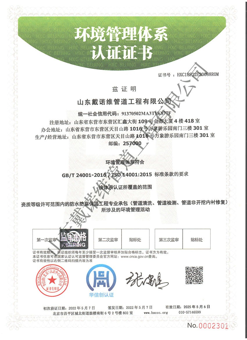 管道非開挖修復工程服務企業資質證書